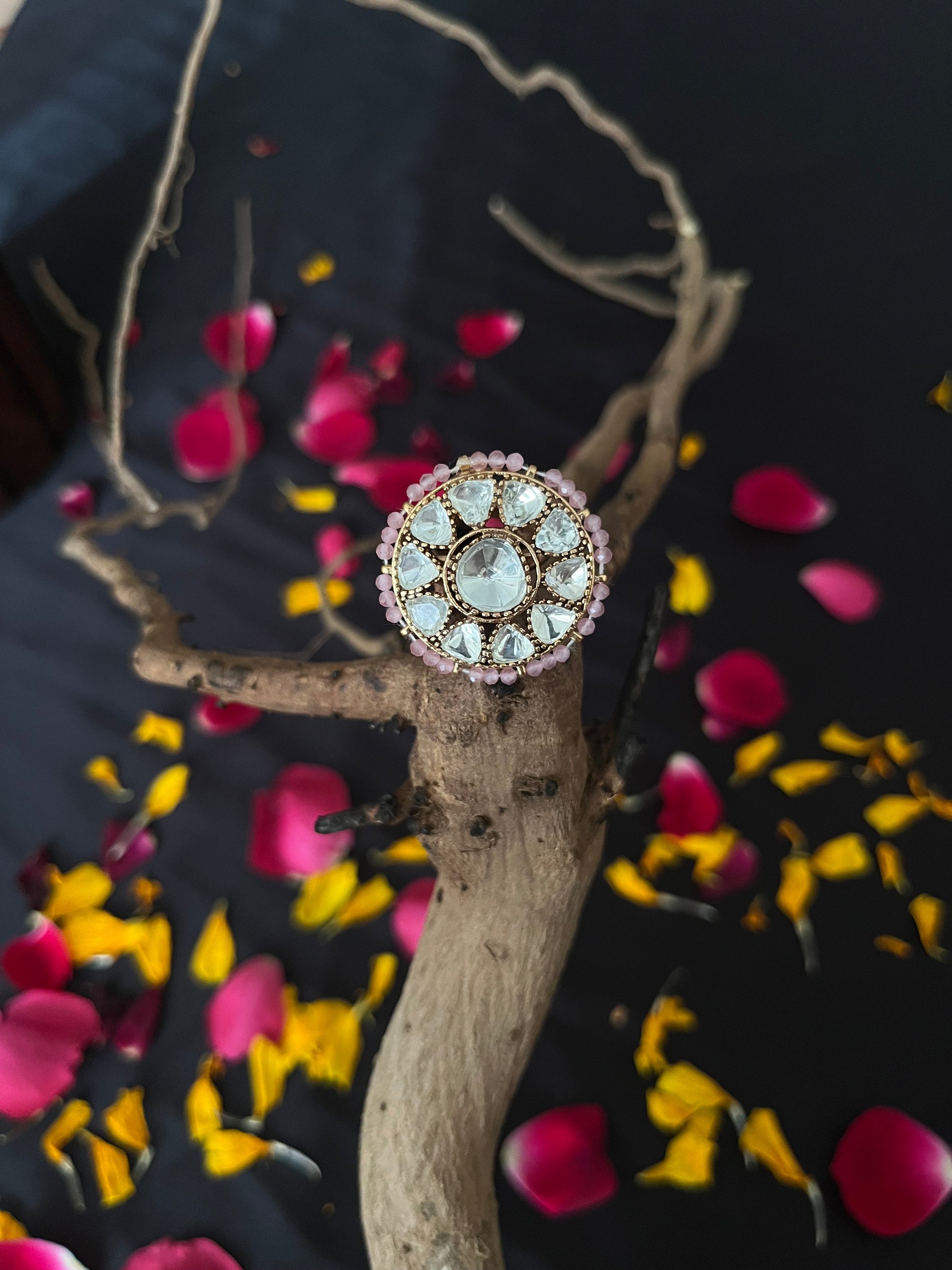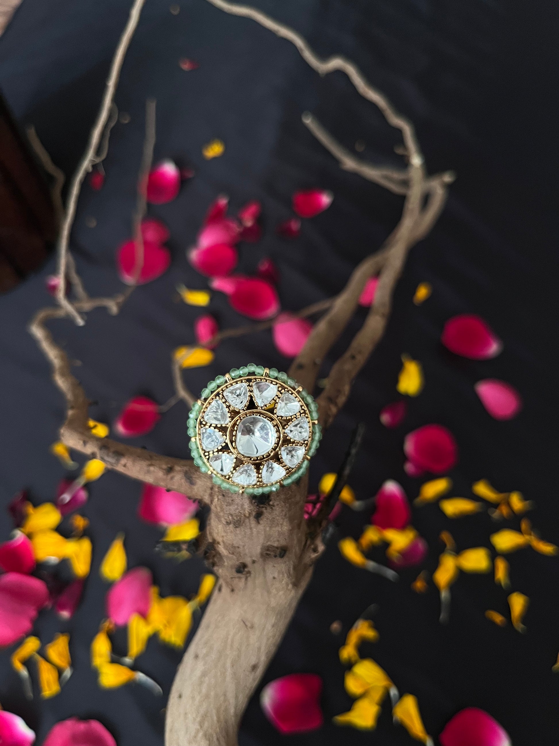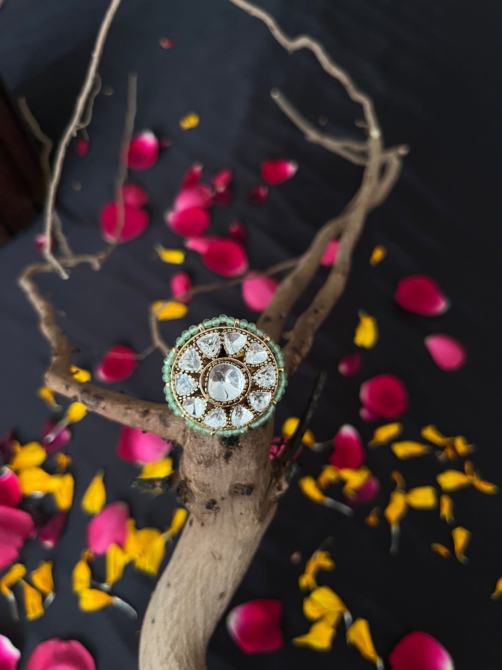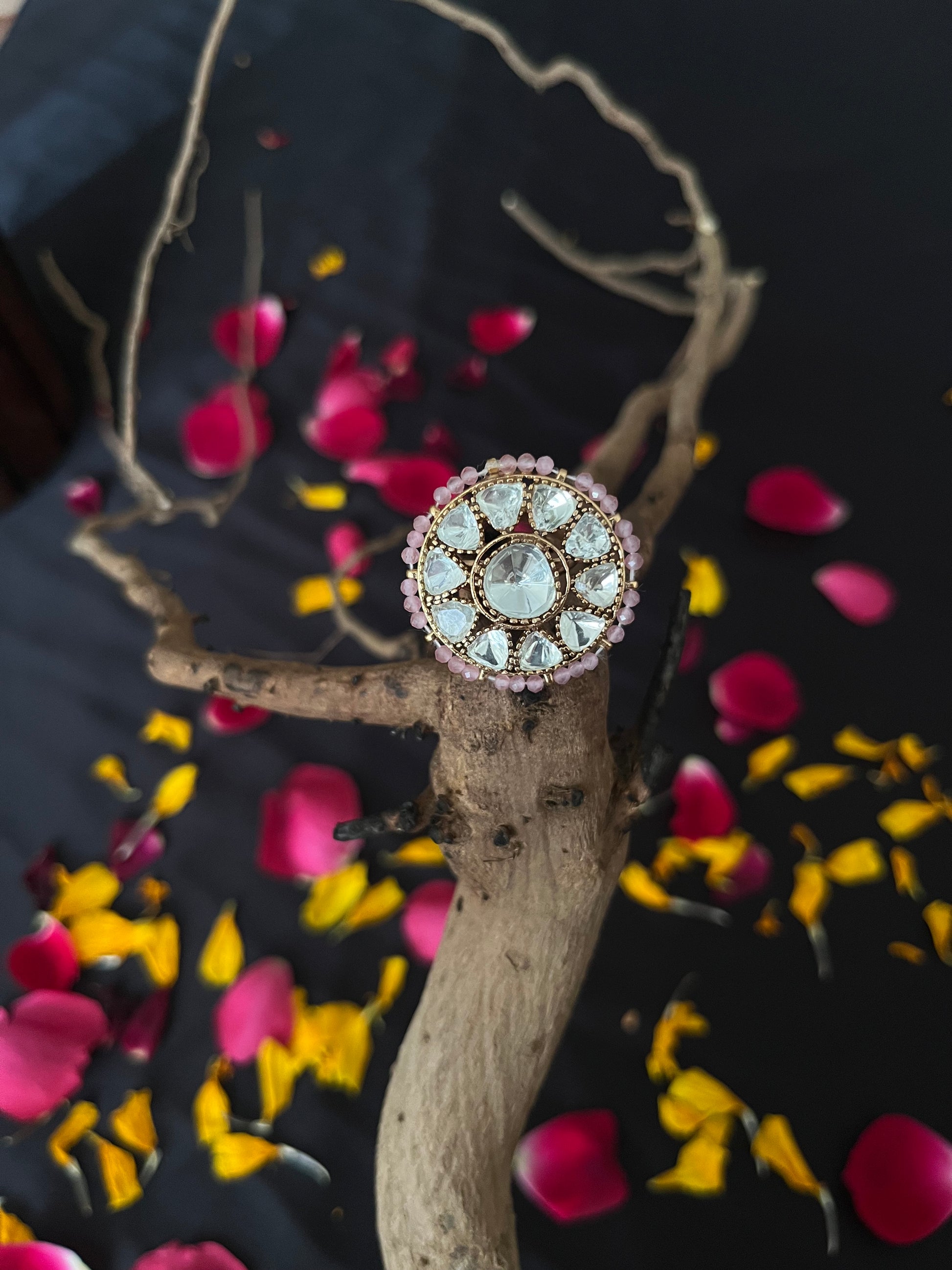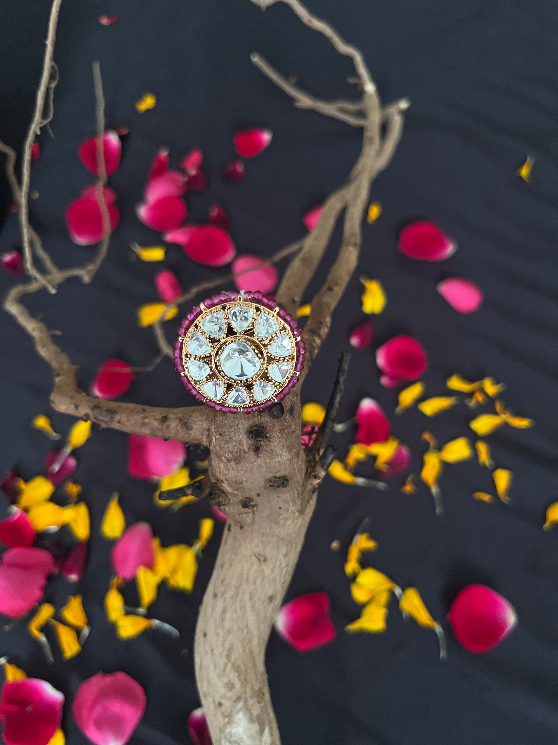 Product description : Elegent Moissanite polki rose gold plated rings. Semi precious Hydro beads bandhai at borders. Adjustable size.