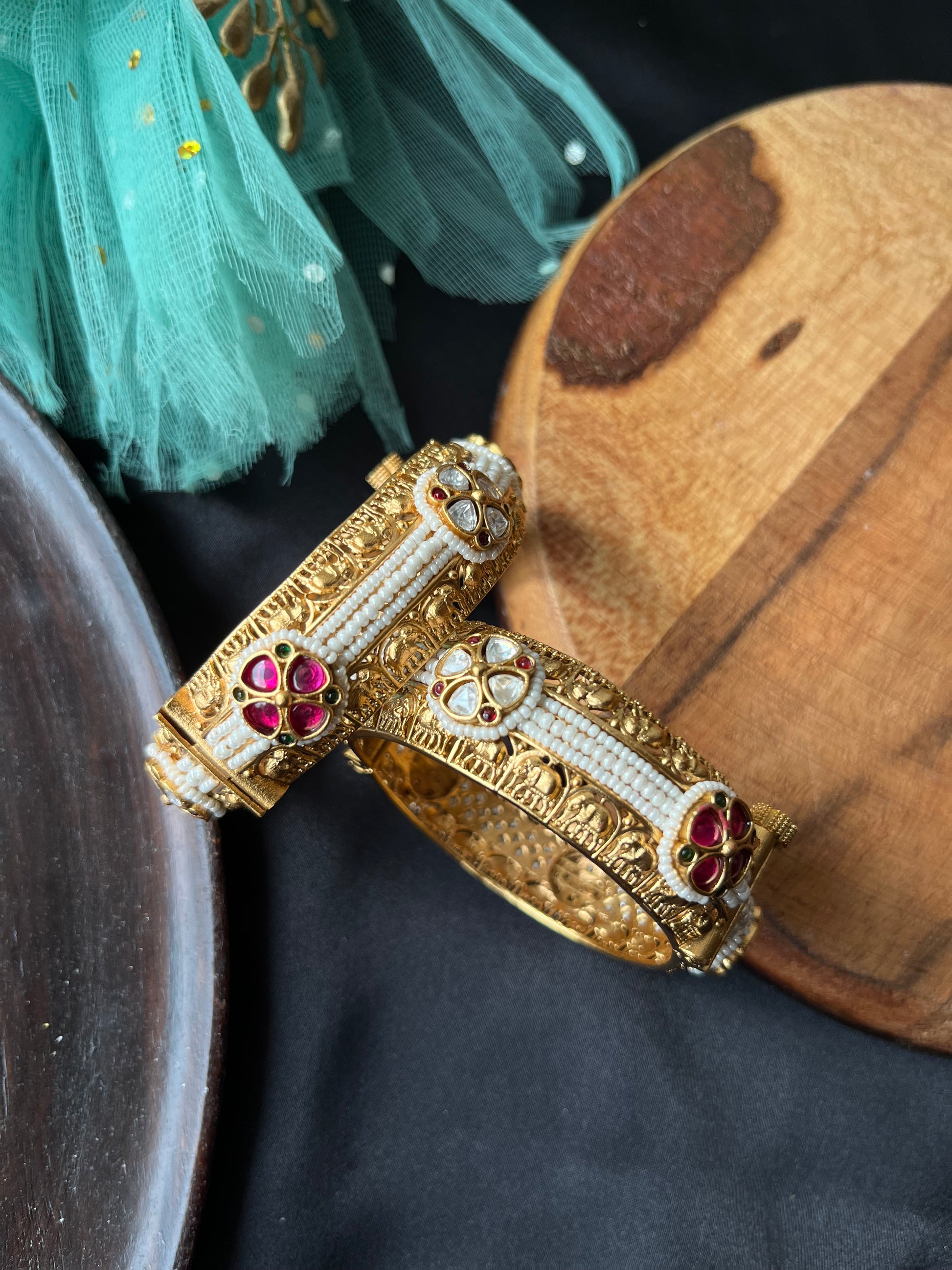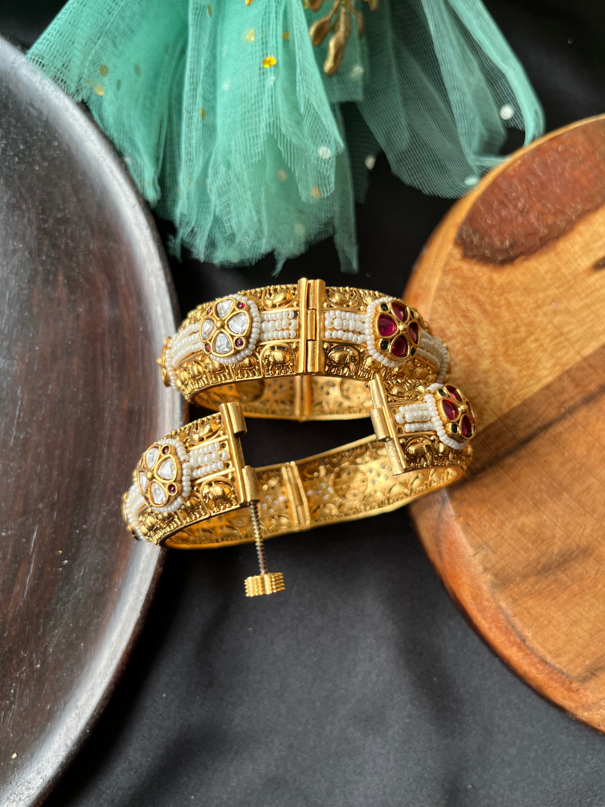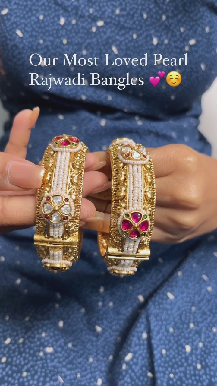 Product description : Openable bangles with pachi kundan and pearl piroi and rajwadi gold polish.