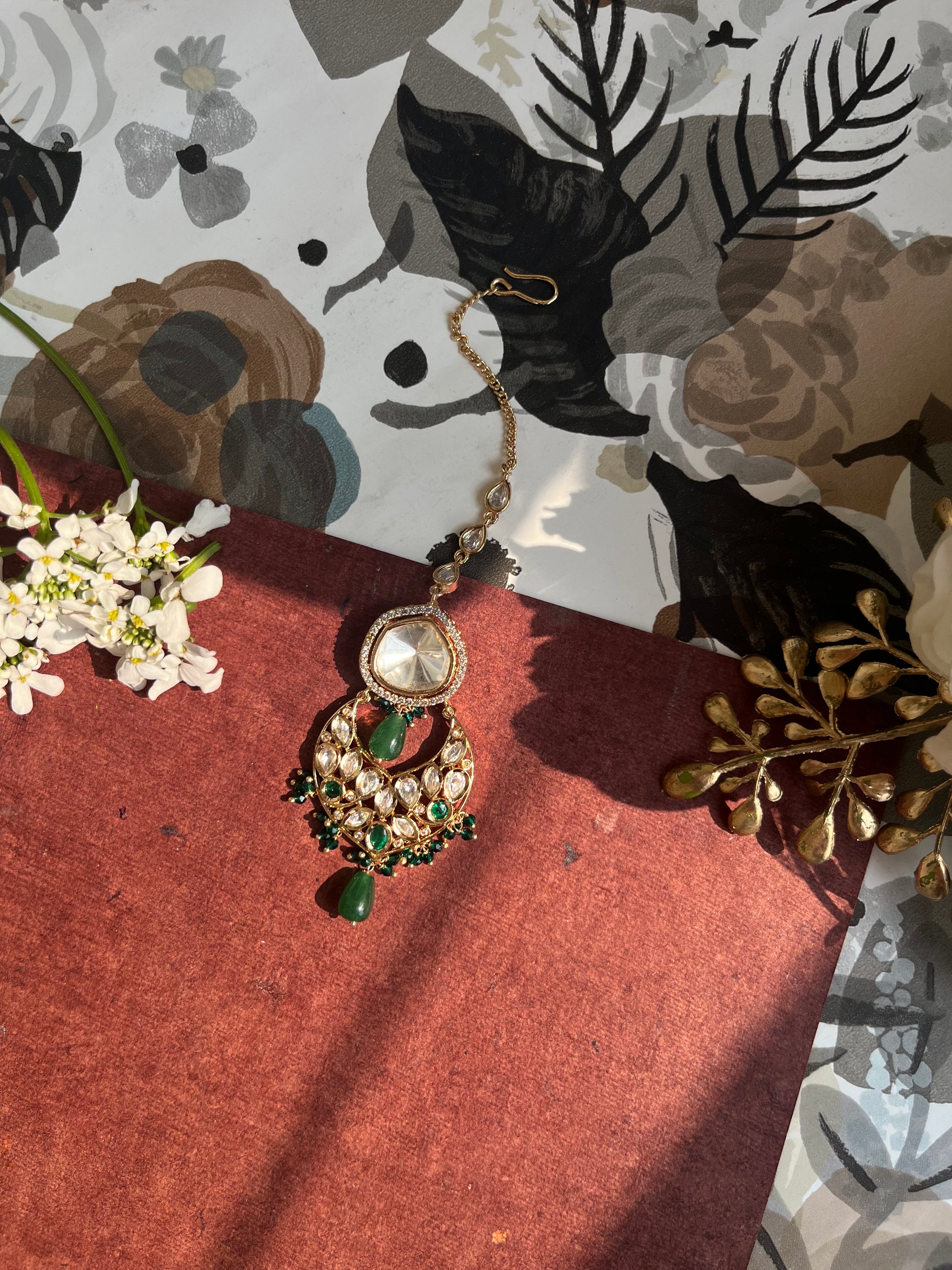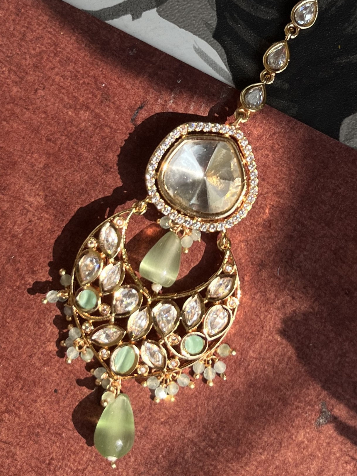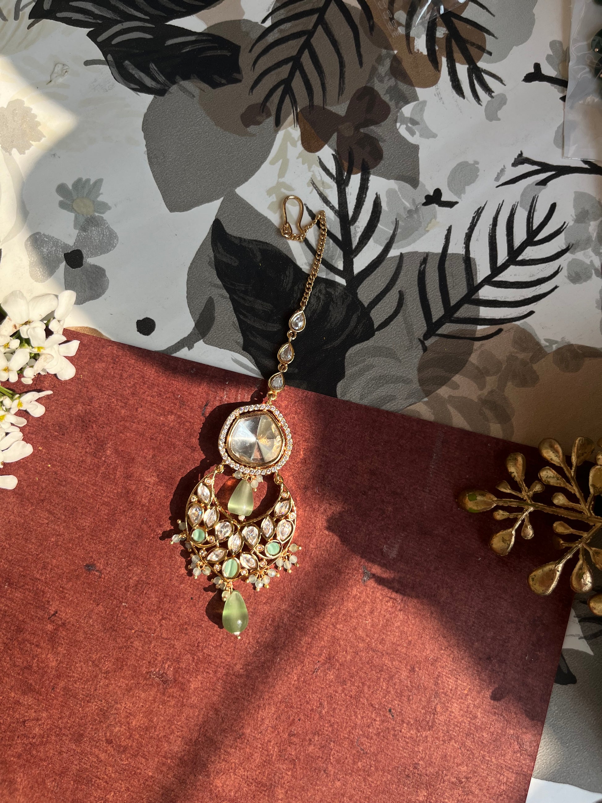 Product description : Mang tika designed in Real parab kundan with silver foiling and mona lisa stones bandhai.