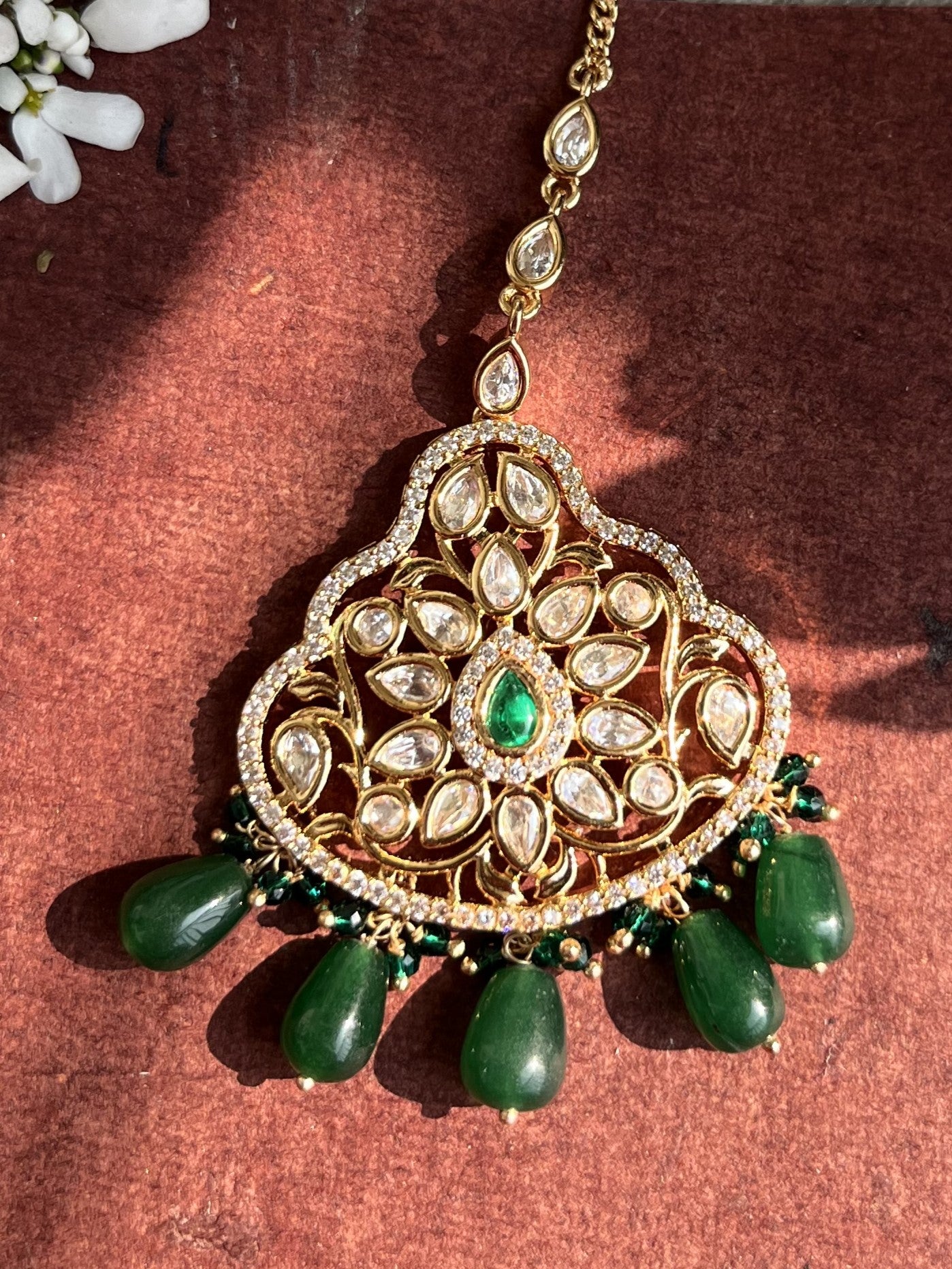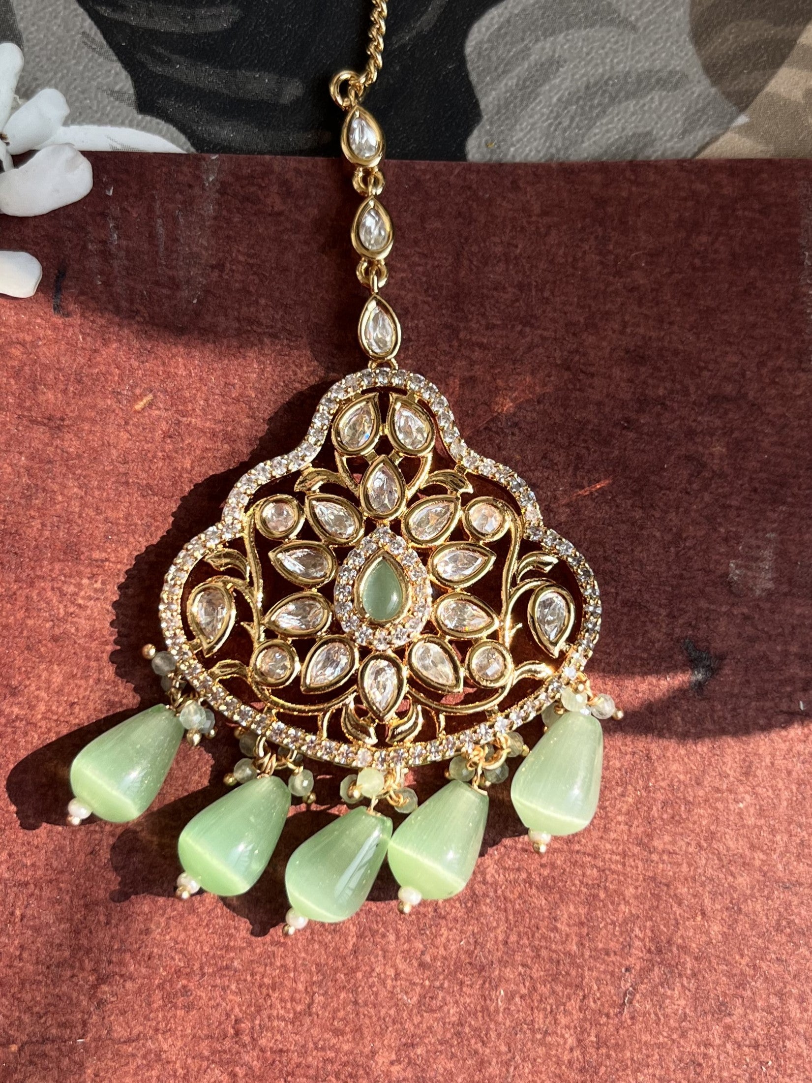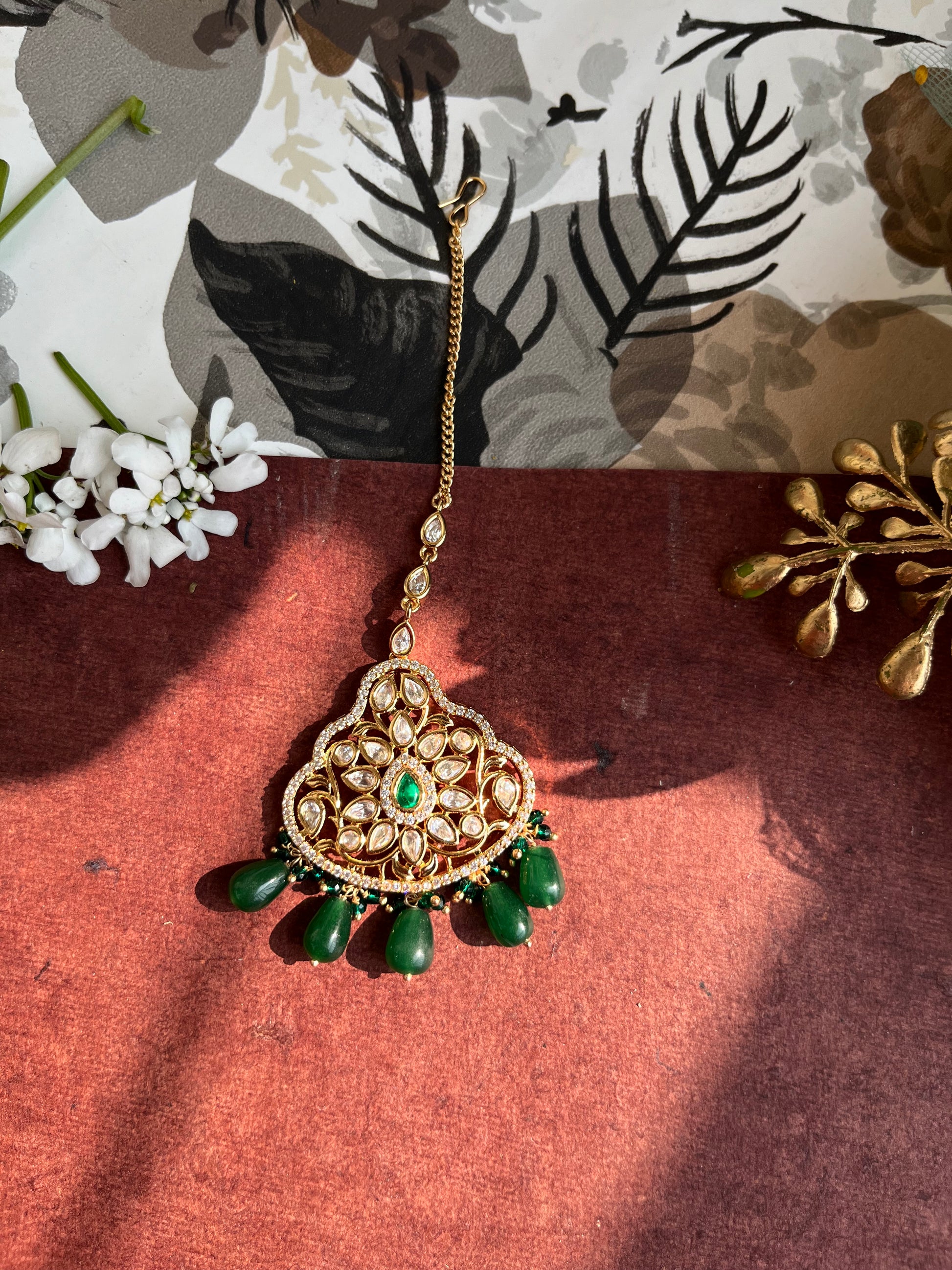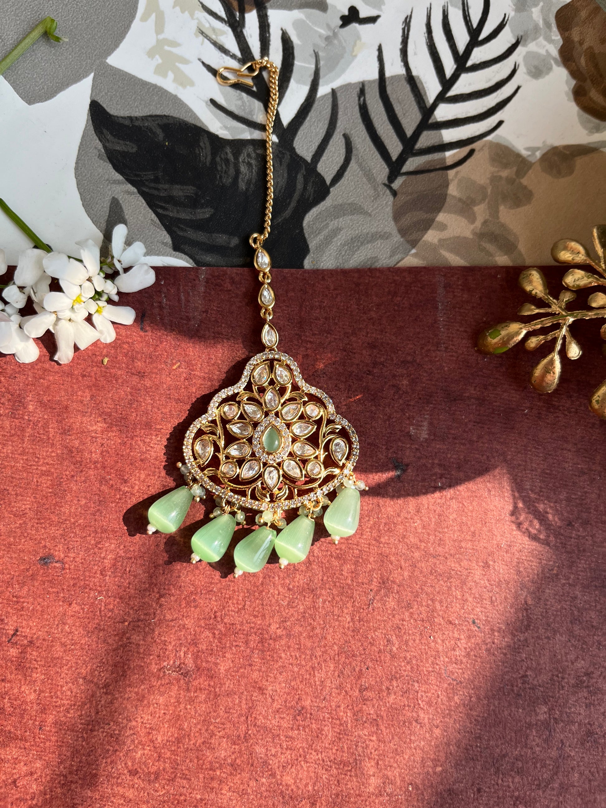 Product description : Mang tika designed in Real parab kundan with silver foiling and mona lisa stones bandhai.