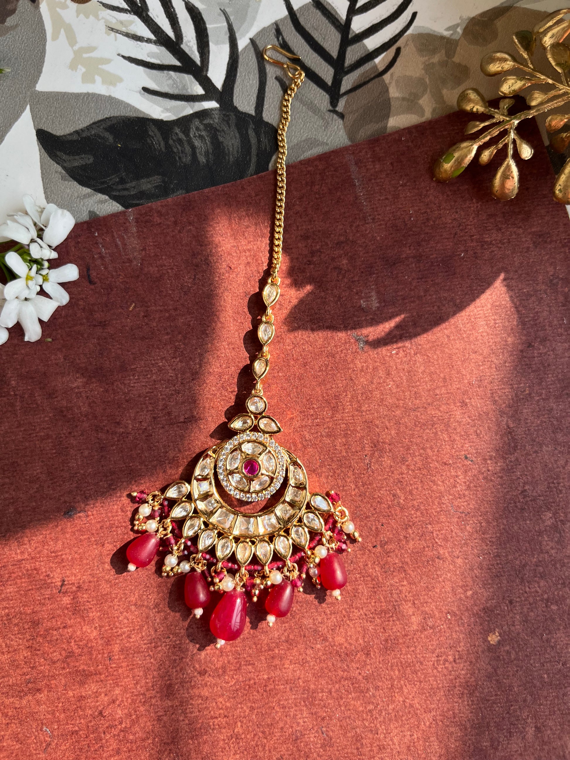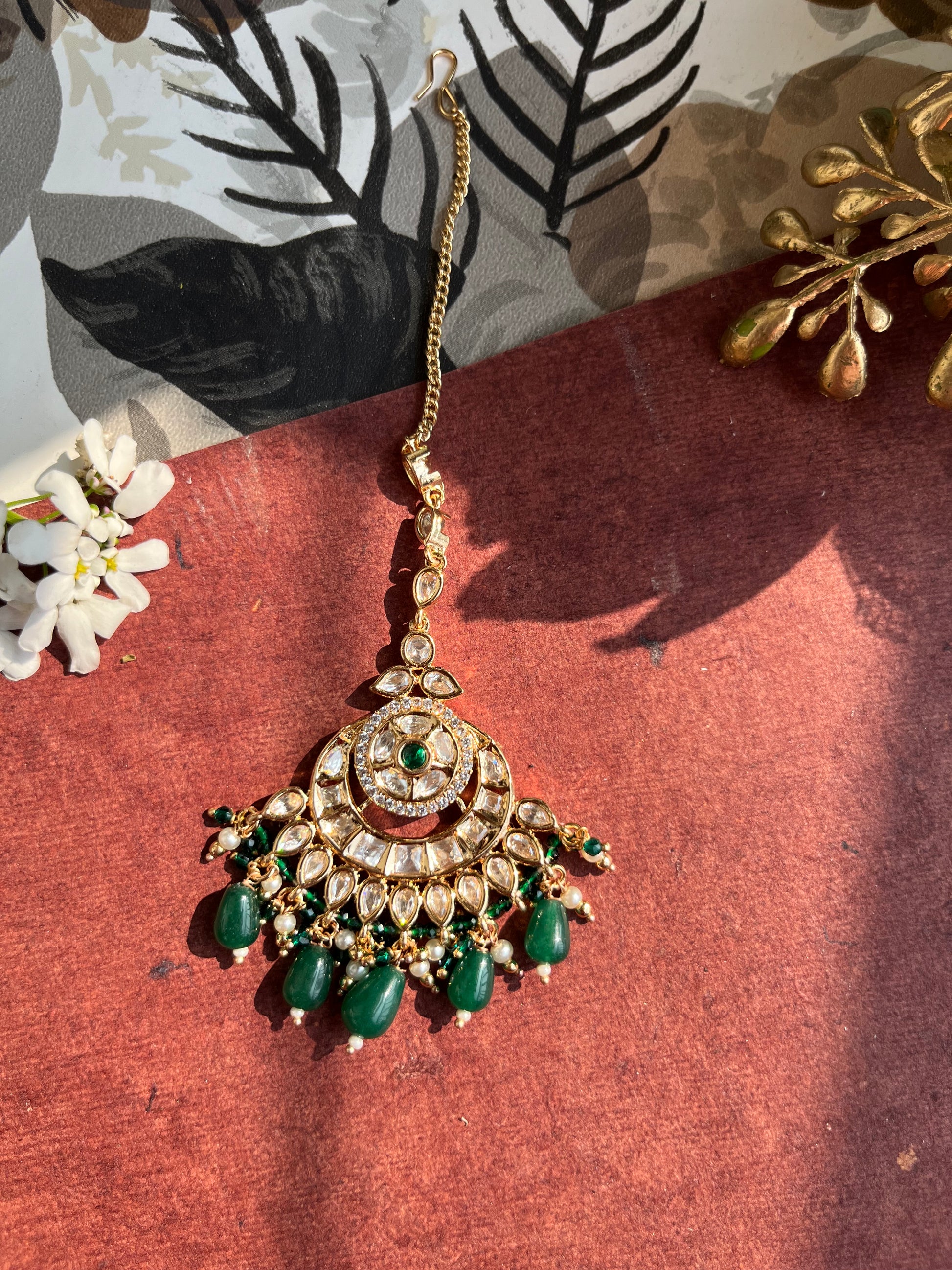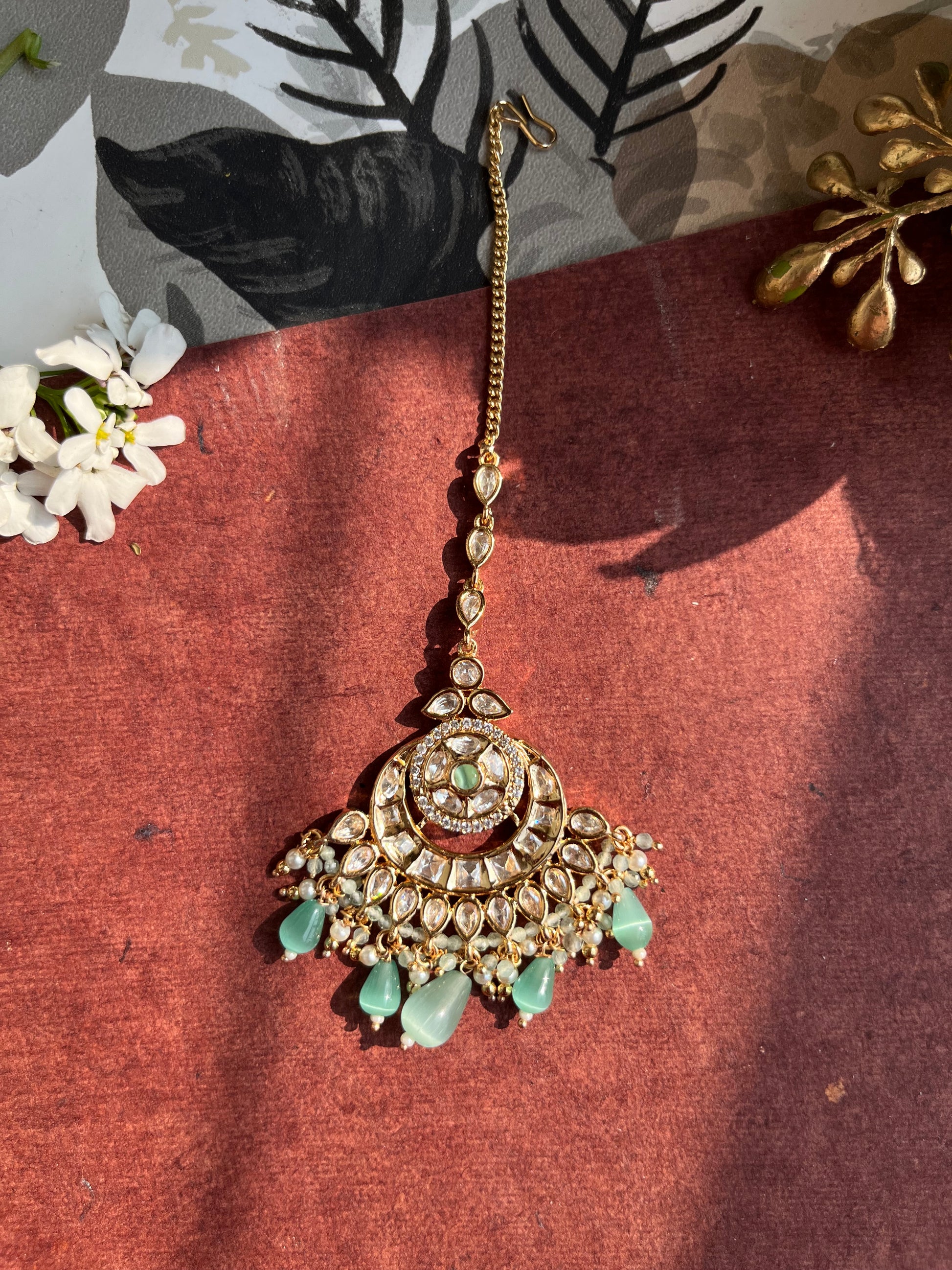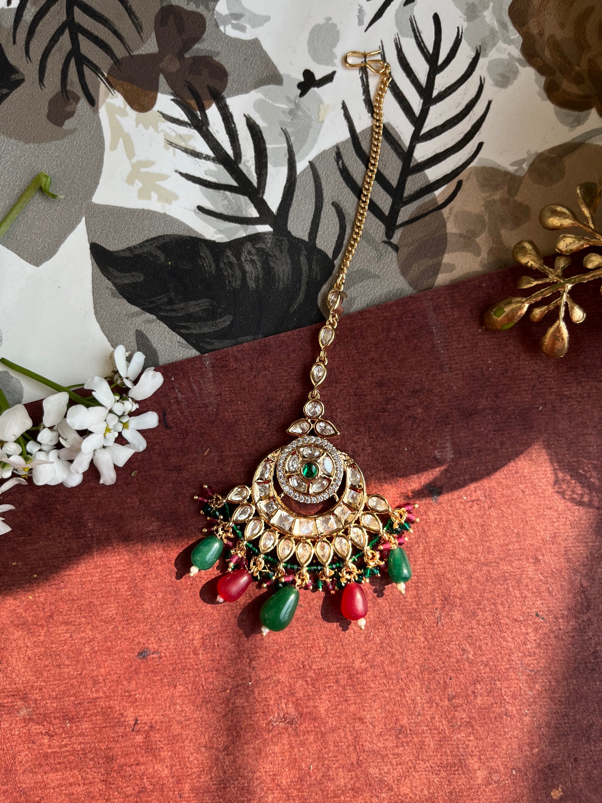 Product description : Mang tika designed in Real parab kundan with silver foiling and mona lisa stones bandhai.