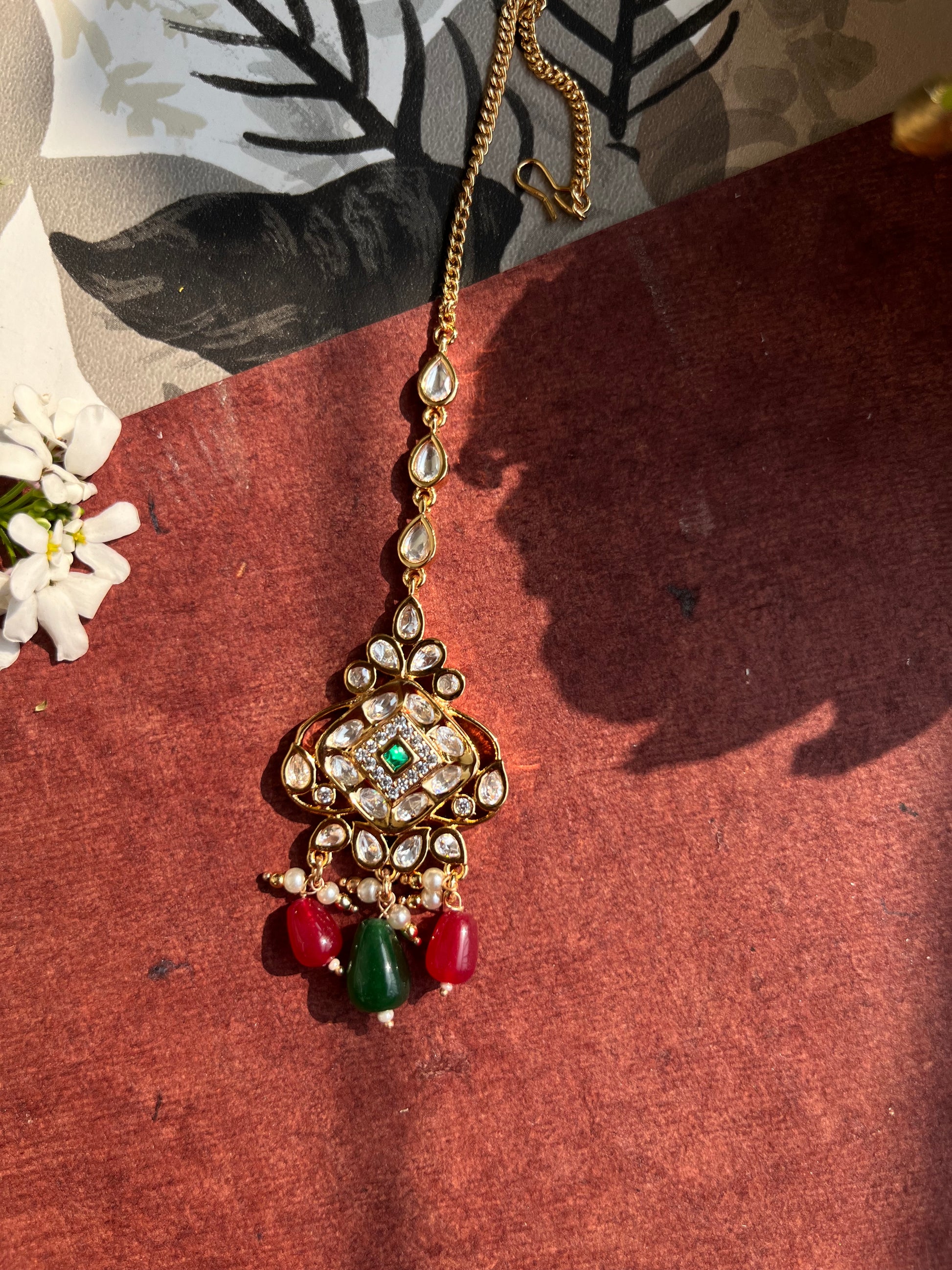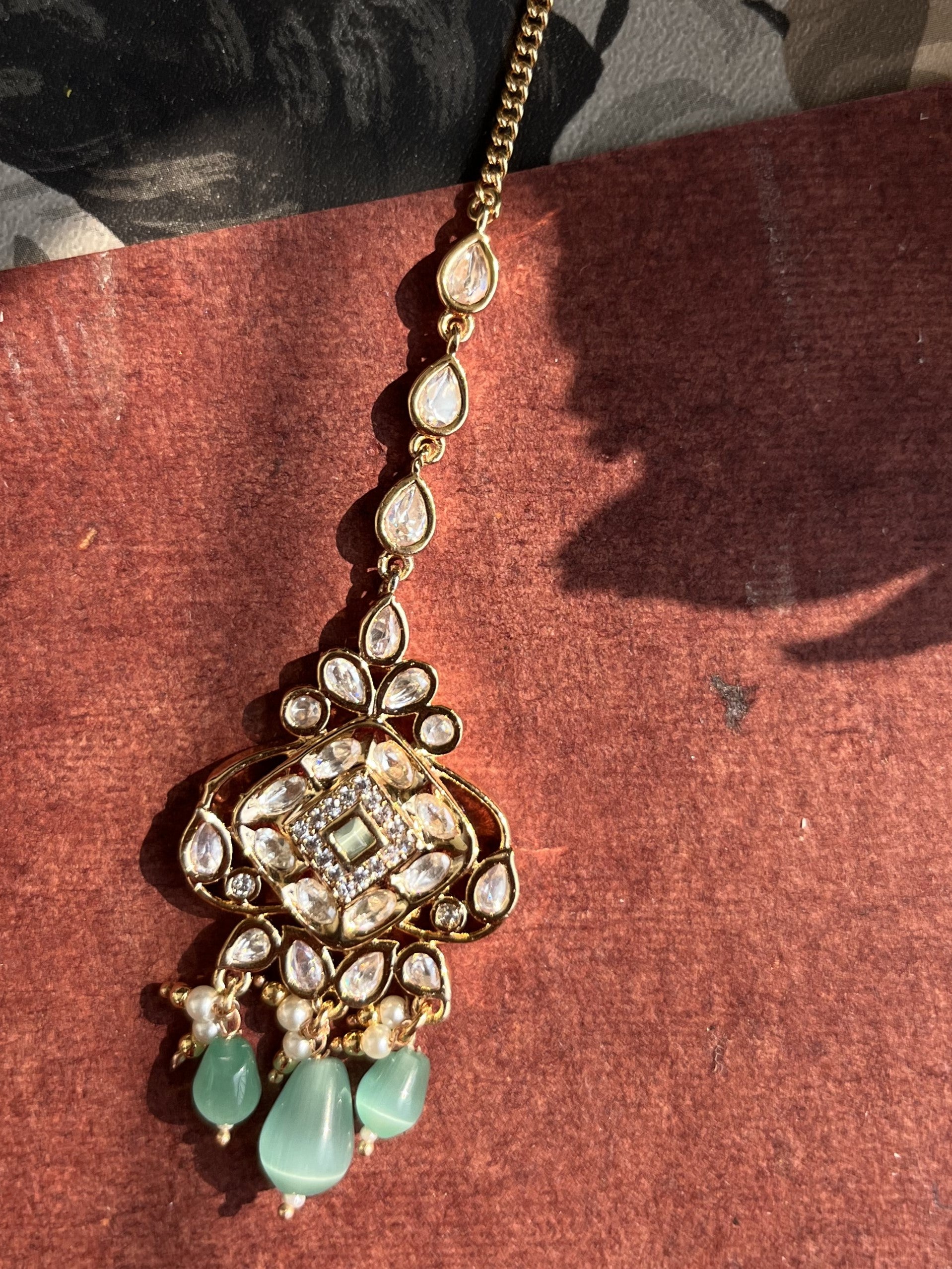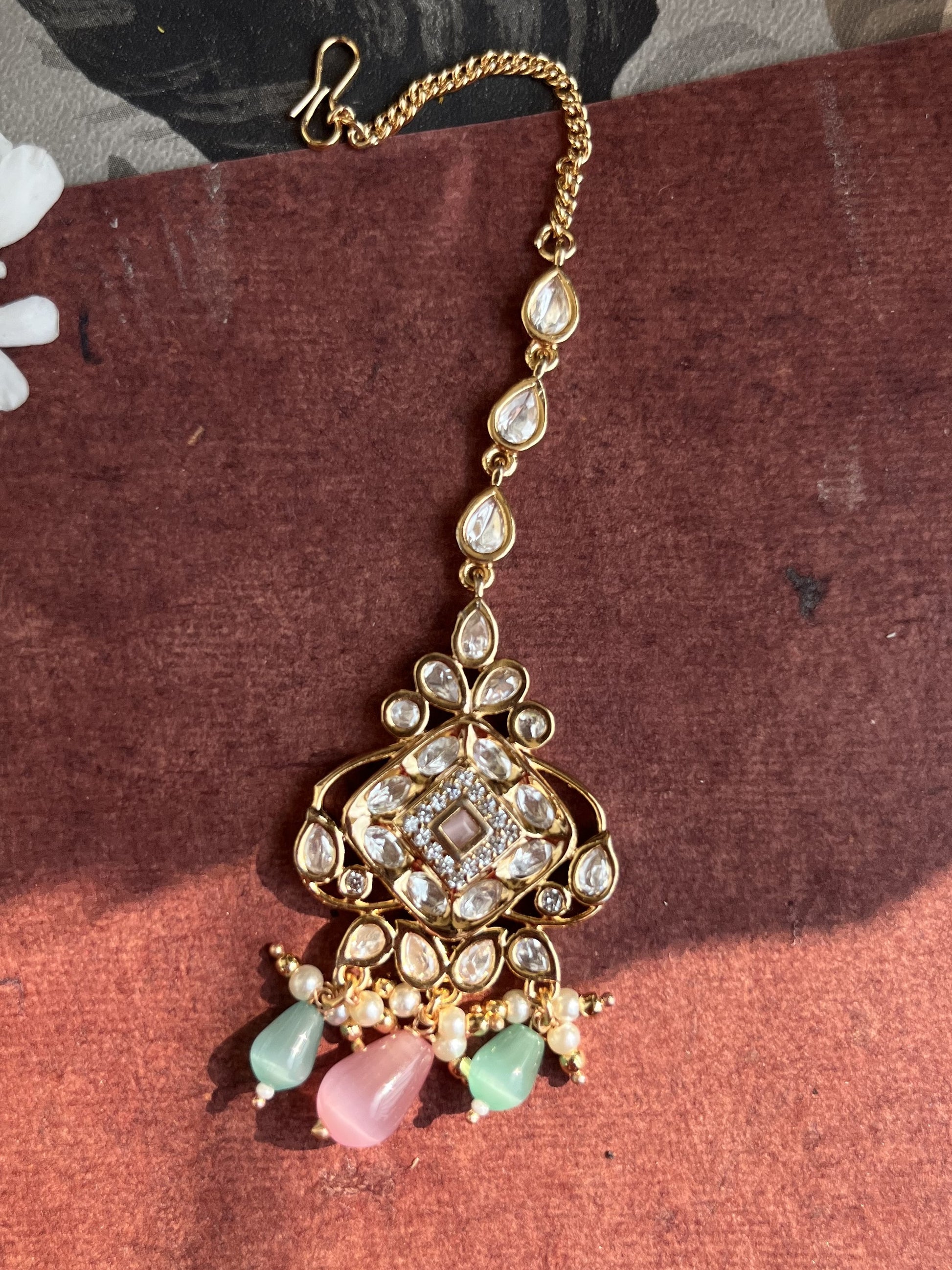 Product description : Mang tika designed in Real parab kundan with silver foiling and mona lisa stones bandhai