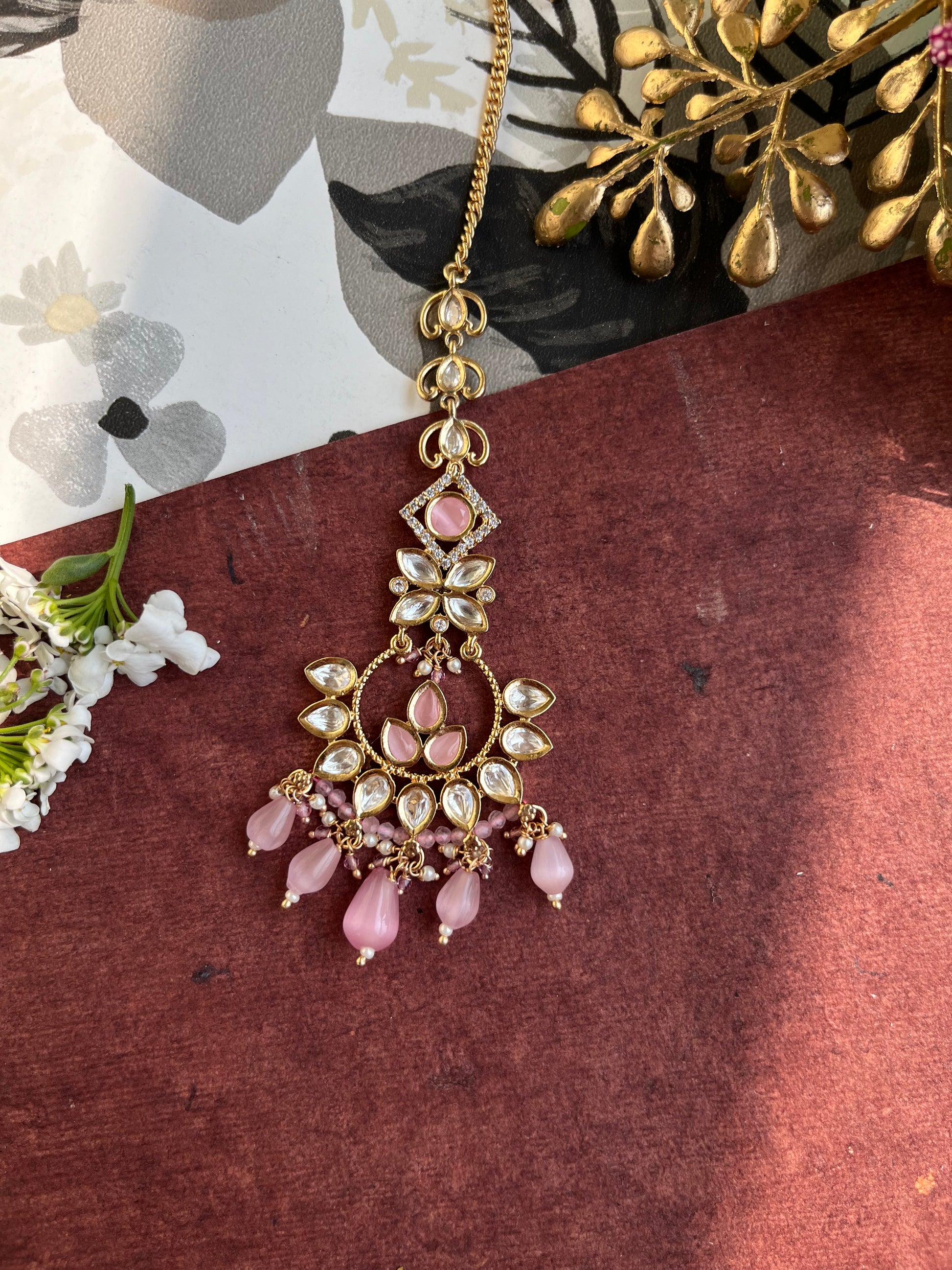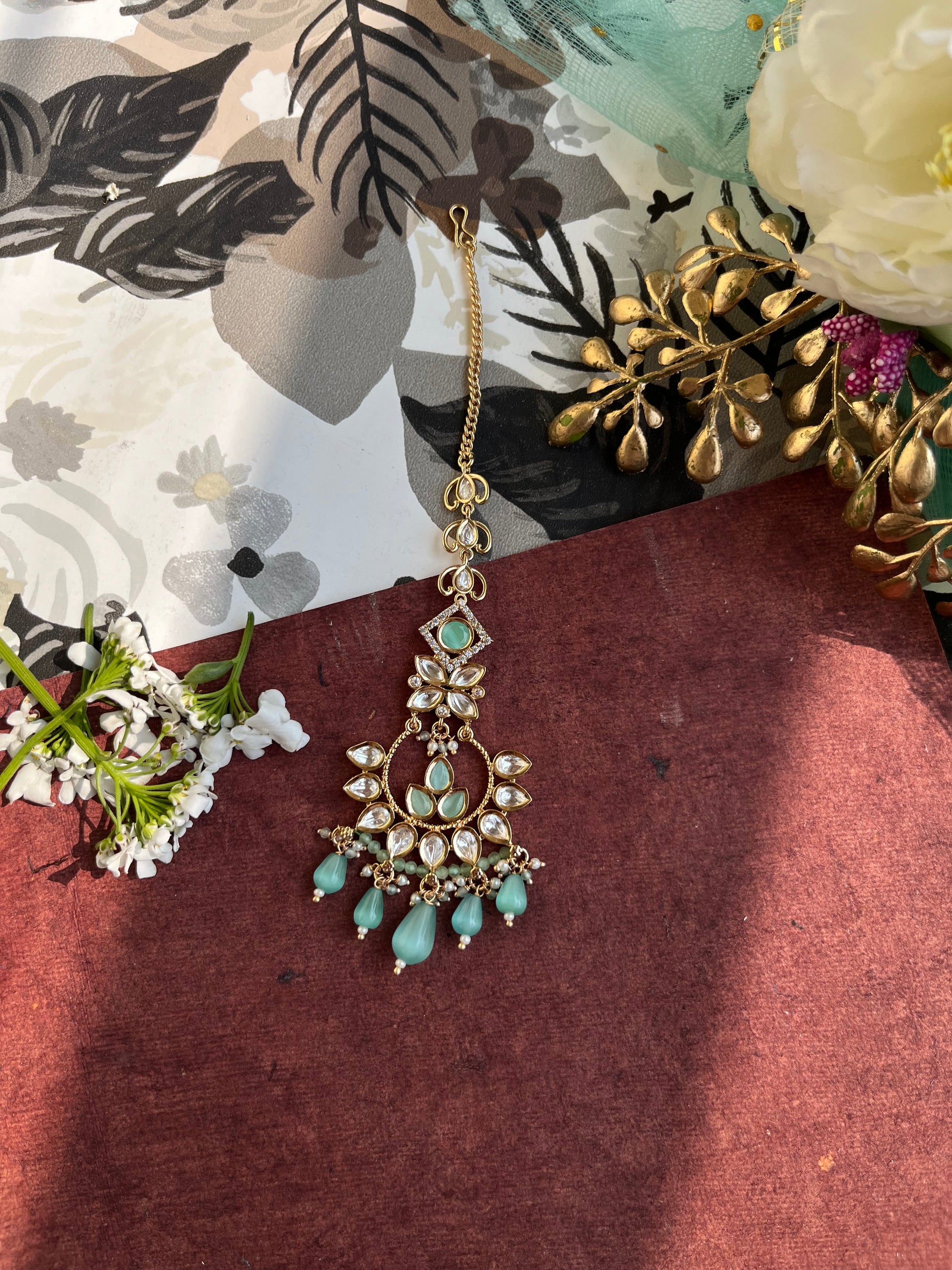 Product description : Mang tika designed in Real parab kundan with silver foiling and mona lisa stones bandhai