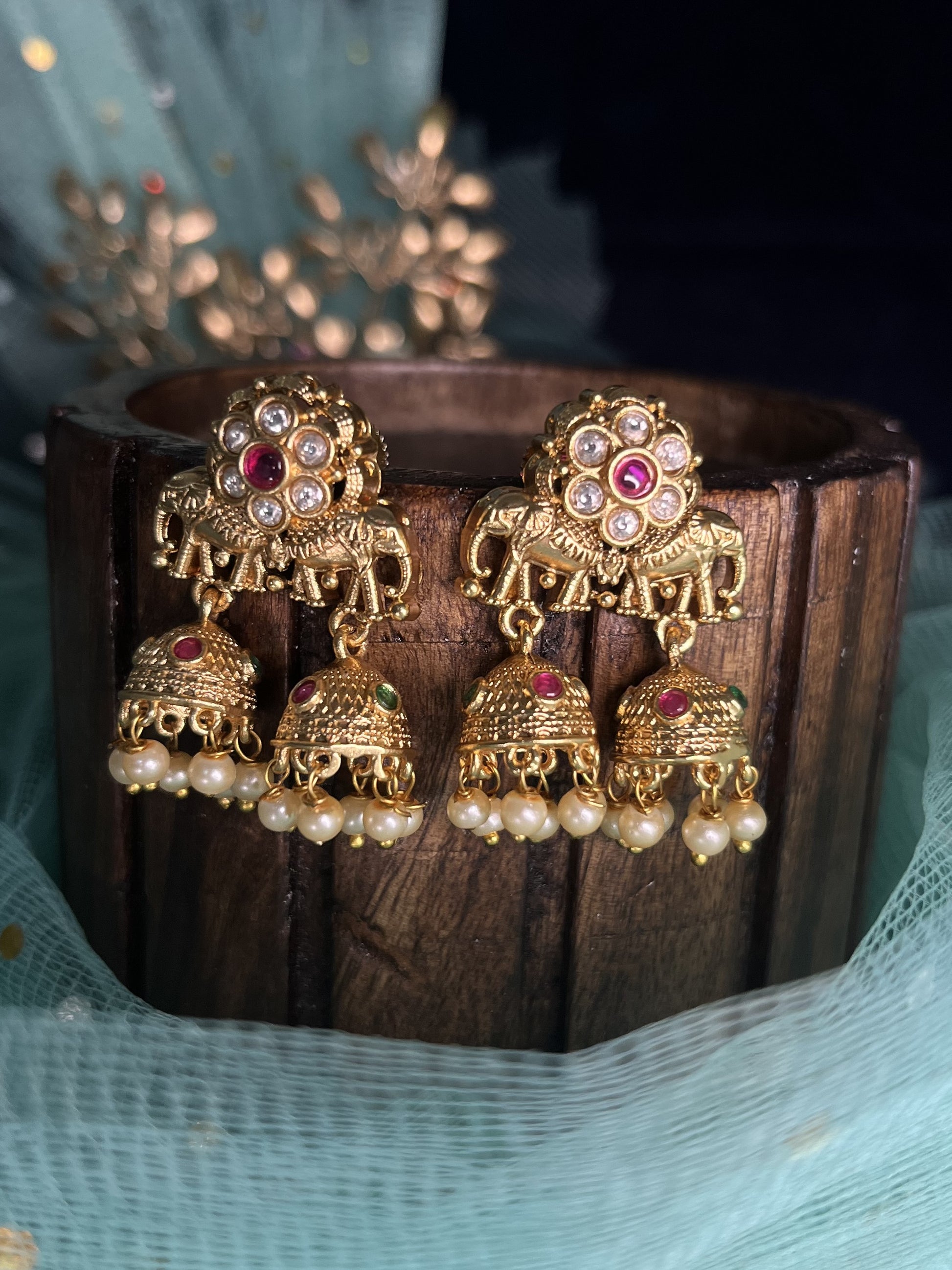 Product description : uniquely designed rajwadi gold double jhumkas studded with pacchi kundans.