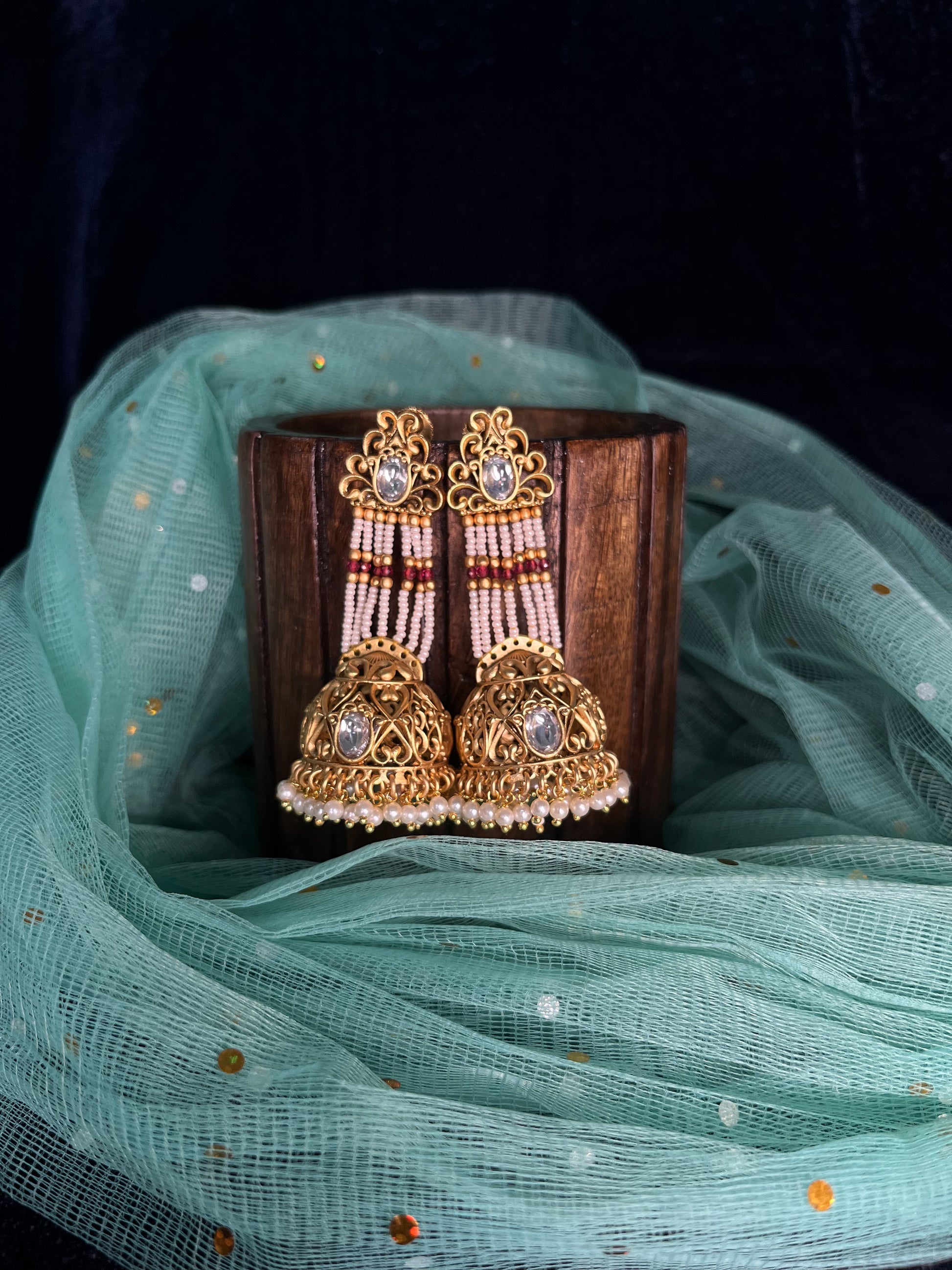 Product description : Rajwadi jhumkas with white pearl piroi.