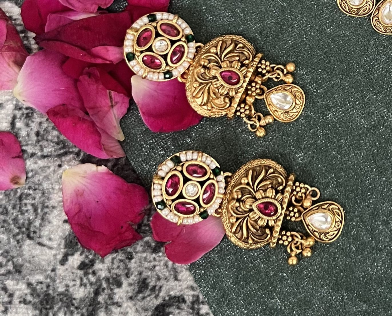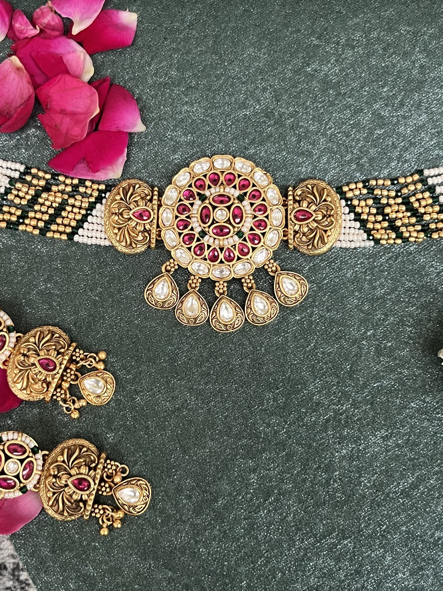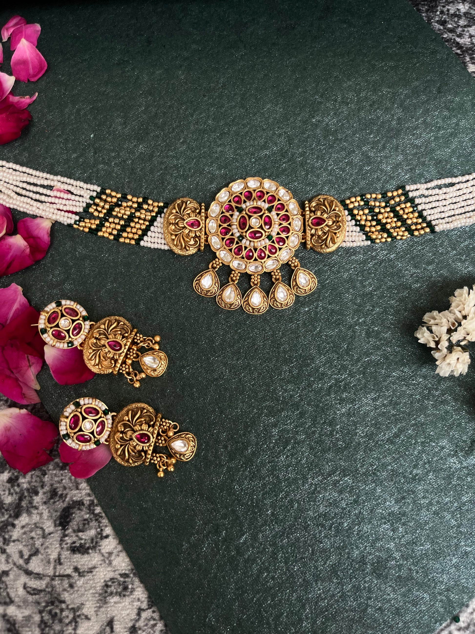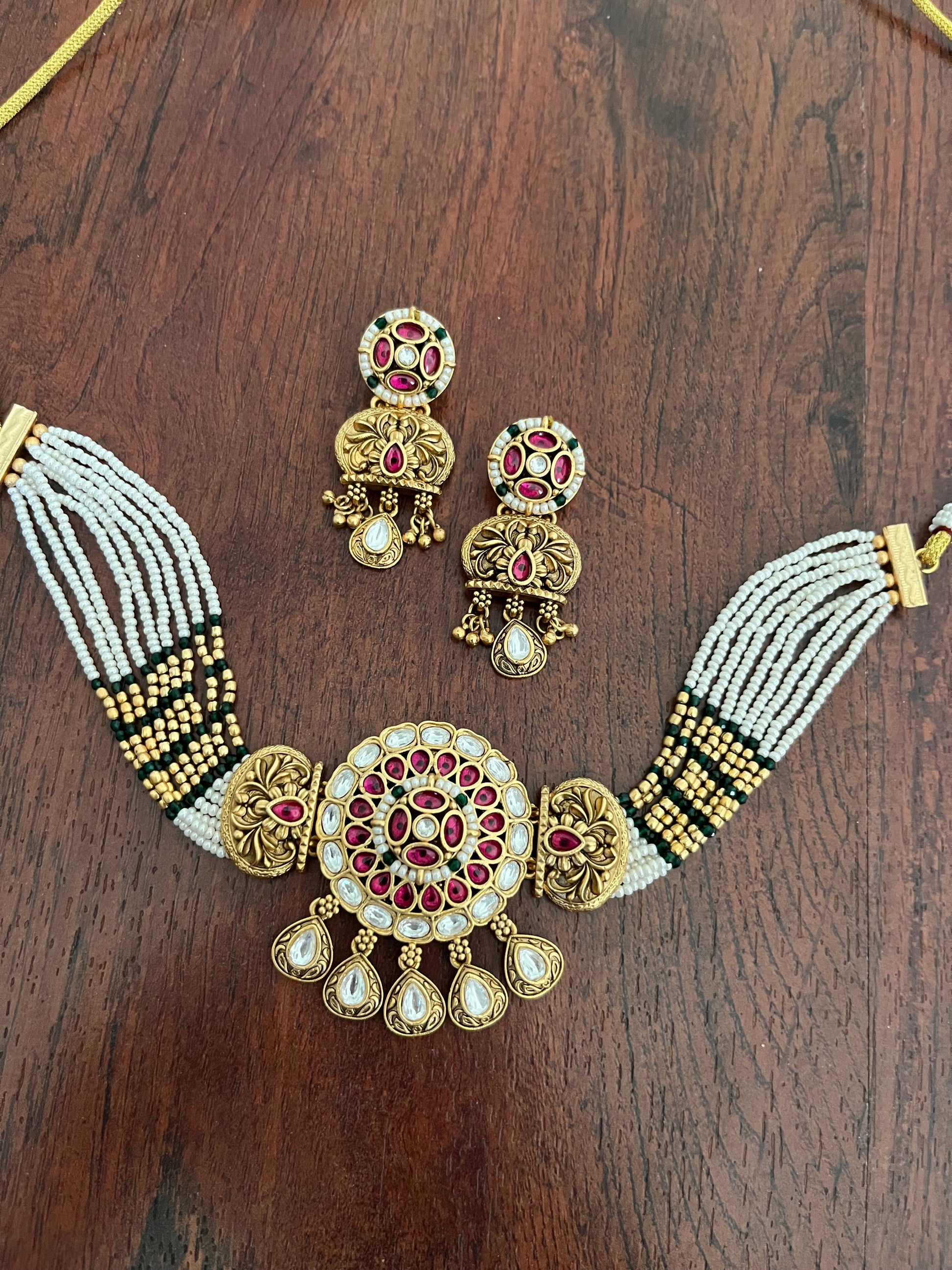 Product description : Anti tarnish Rajwadi antique choker studded with finest kundans. Semi precious beads piroi with a touch of golden balls in the centre.Paired with elegant and light weight earrings.